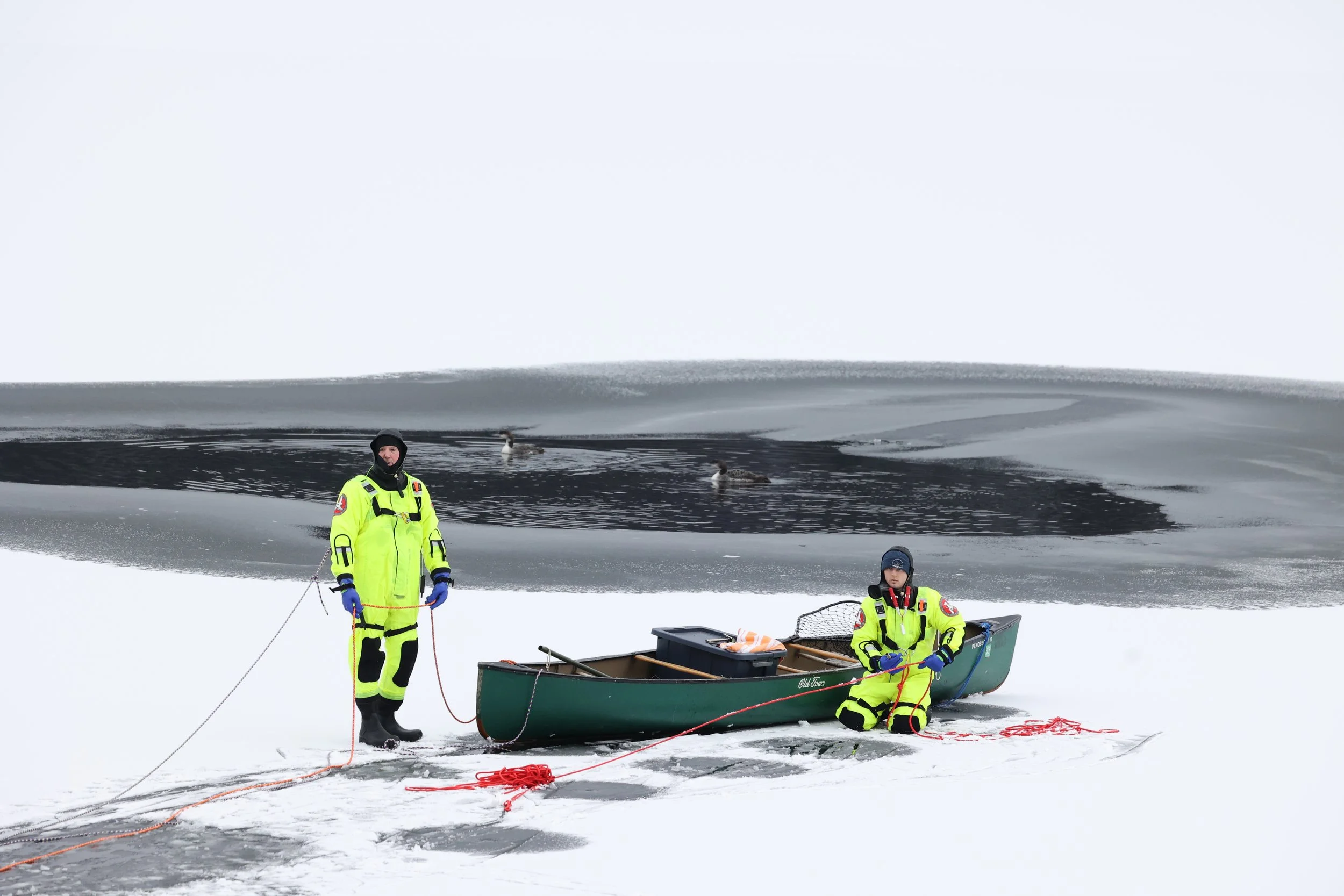 Volunteer Don Andrews and ACLC Research Biologist Griffin Archambault tend to ice rescue gear. Photo by Nina Schoch.